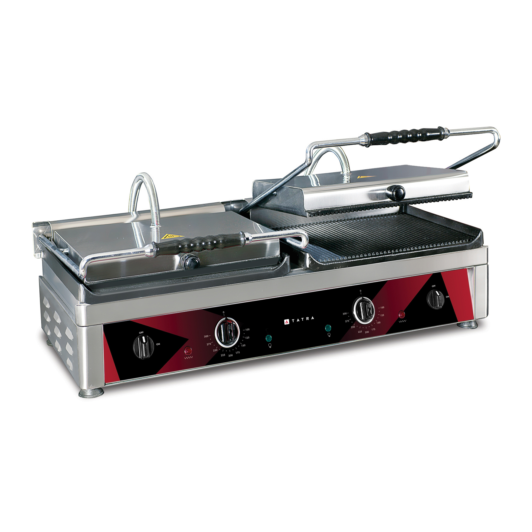 Kontakitnis grilius TATRA TCG 3627 RR SS puikiai tinka mėsos, žuvies, daržovių ir sumuštinių kepimui bet kurioje maitinimo įstaigoje. Šis modelis turi dvi šildymo zonas su nepriklausomu valdymu. 1 zona: briaunotos viršutinės ir apatinės plokštės. 2 zona: lygios viršutinės ir apatinės plokštės. Ketaus plokščių matmenys yra 360х270 mm. Korpusas pagamintas iš nerūdijančio plieno. Kontaktinėse grotelėse yra nuvarvėjimo padėklas, kuris labai supaprastina įrangos valymą. Grilyje yra elektromechaninis valdymo pultas su maitinimo jungikliu, termostatu ir galios bei šilumos indikatoriais. Termostatas leidžia reguliuoti temperatūrą nuo 50 iki 300°C. Optimali darbo temperatūra yra 200-250°C. Nustatyta temperatūra pasiekiama maždaug per 15 minučių. Matmenys 820х500х300 mm. Galia 2,5+2,5 kW. Įtampa 230 V.