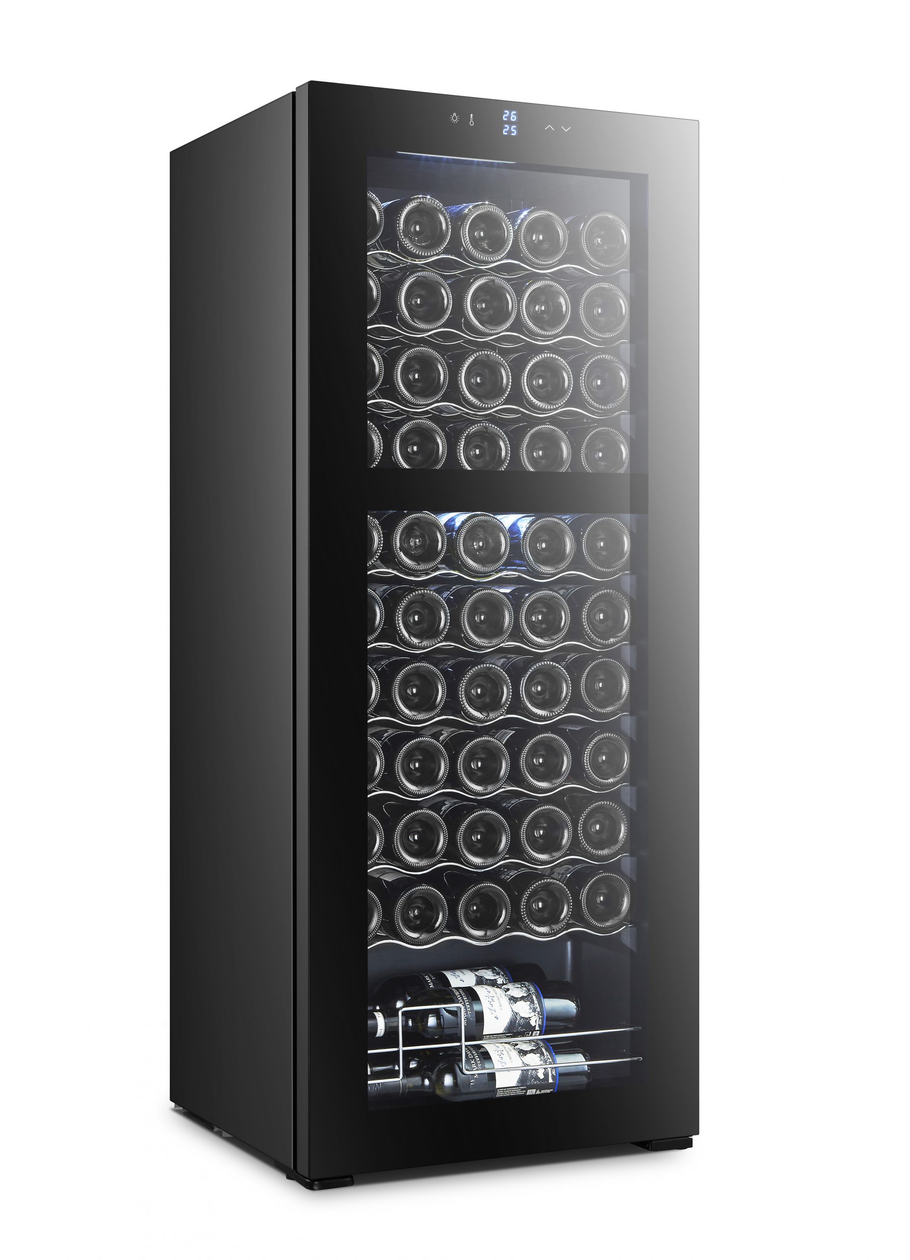 Talpa: 55 buteliai. 2 temperatūros zonos. Temperatūros diapazonas 5-18°С. Pirmoji zona: 3 medinės lentynos; antroji zona: 6 medinės lentynos. Kompresorius. Reguliuojamas termostatas. Stiklinės durys. Užraktas.